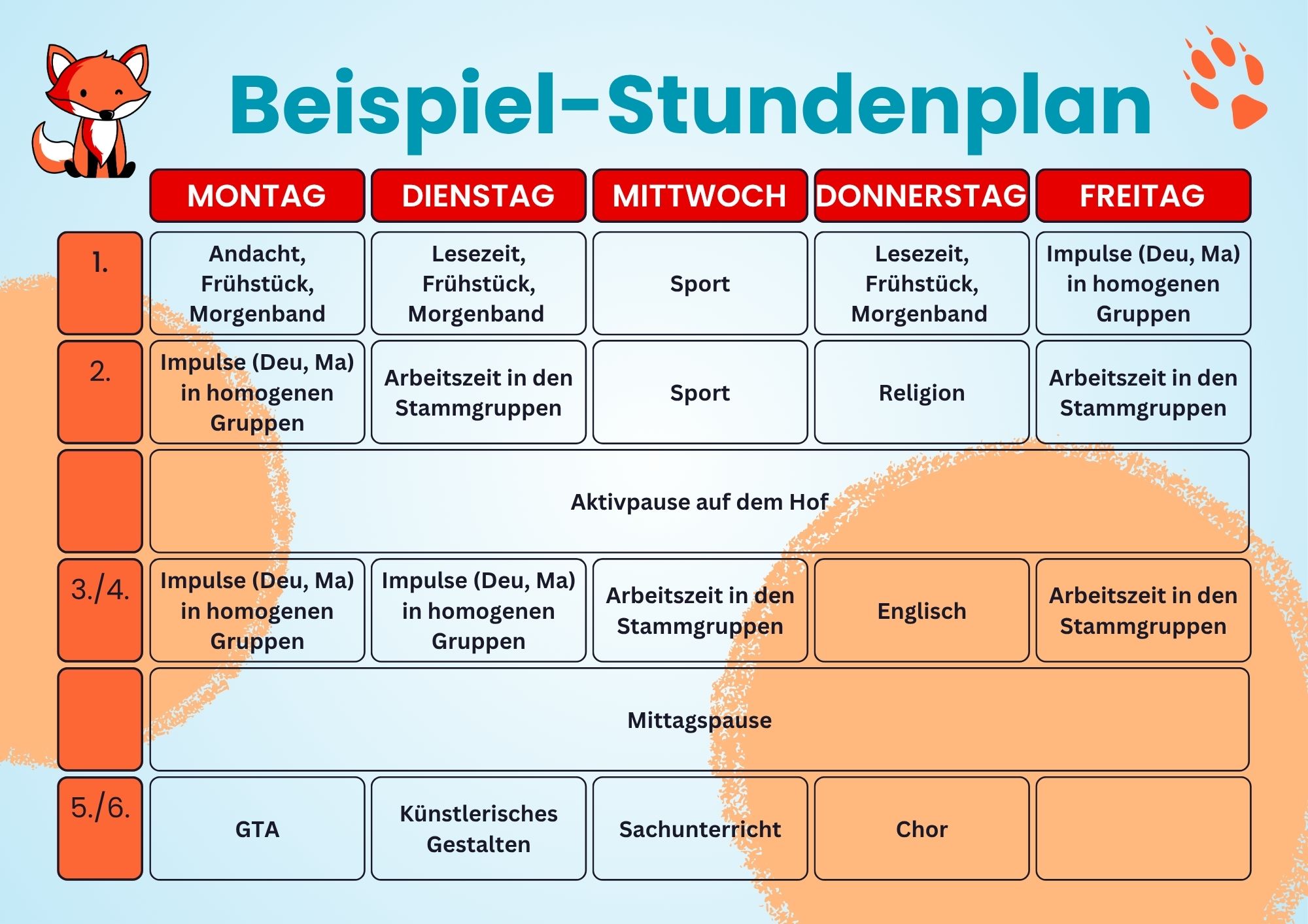 Während des altershomogenen* Fachunterrichts (Deutsch, Mathe, Englisch und Sachunterricht) erarbeiten die Kinder mit Unterstützung des pädagogischen Teams Stück für Stück ihre Lerninhalte. Viele Wege führen nach Rom... und so führen auch diverse Methoden zu den verschiedenen Lernzielen. Die Kinder können dabei auf verschiedene Arbeitsmaterialien zurückgreifen und erfahren Hilfe von ihren Lehrkräften sowie ihren Erziehern/Erzieherinnen.